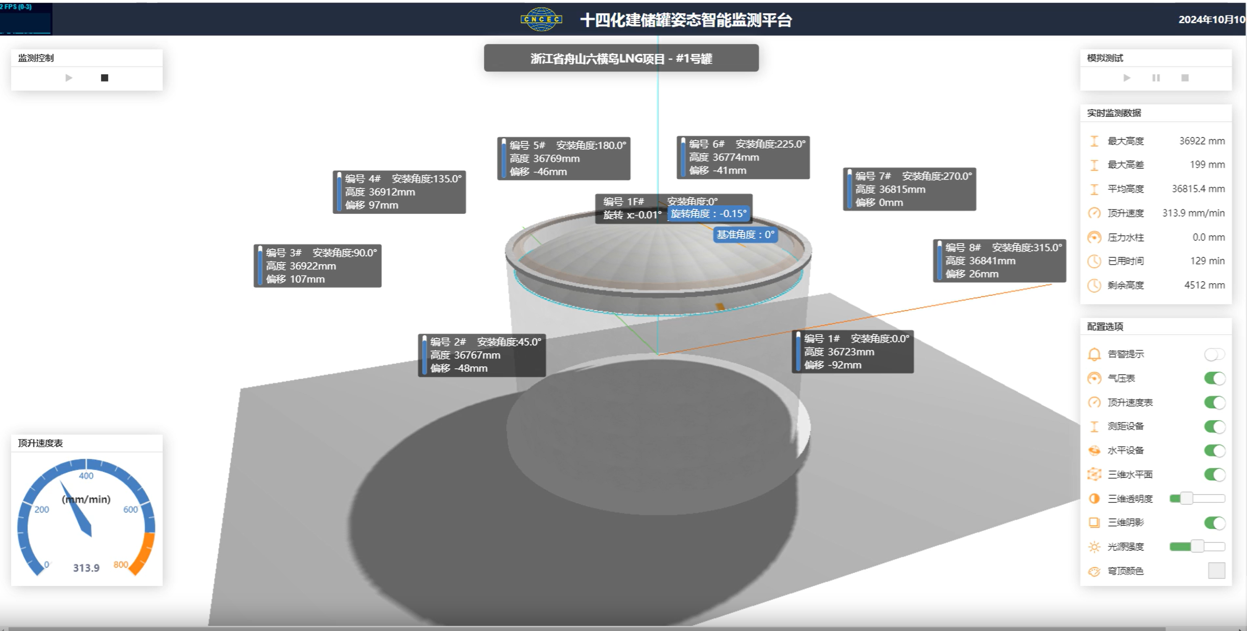 為確保“鋼帽”升起均衡平穩(wěn),浙能舟山六橫LNG接收站使用了“硬核科技”——數(shù)智化頂升系統(tǒng)。該系統(tǒng)主要依托遍布罐體的“神經(jīng)”——傳感器,實(shí)時(shí)收集風(fēng)壓、平衡鋼絲繩的拉力值以及頂升方位和速度等信息,并通過(guò)三維可視化智控軟件,實(shí)現(xiàn)風(fēng)壓智能控制、拱頂智能配重、頂升方位智能糾偏等功能,大幅減少了人工操作可能帶來(lái)的誤差,讓整個(gè)氣頂升過(guò)程精準(zhǔn)、智能、安全。