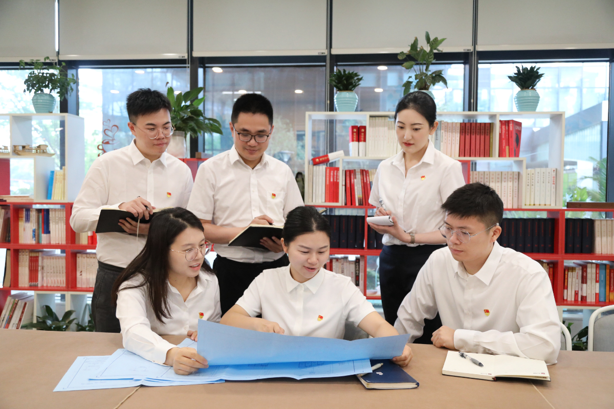 03-銅獎(jiǎng)項(xiàng)目-浙江浙能科技環(huán)保集團(tuán)股份有限公司的《“蓄式”而發(fā),點(diǎn)“燃”高質(zhì)量發(fā)展新引攀——高效RTO技術(shù)在能源化工工程的應(yīng)用與示范》青創(chuàng)團(tuán)隊(duì)成員們正在進(jìn)行項(xiàng)目研討。 張琪 提供