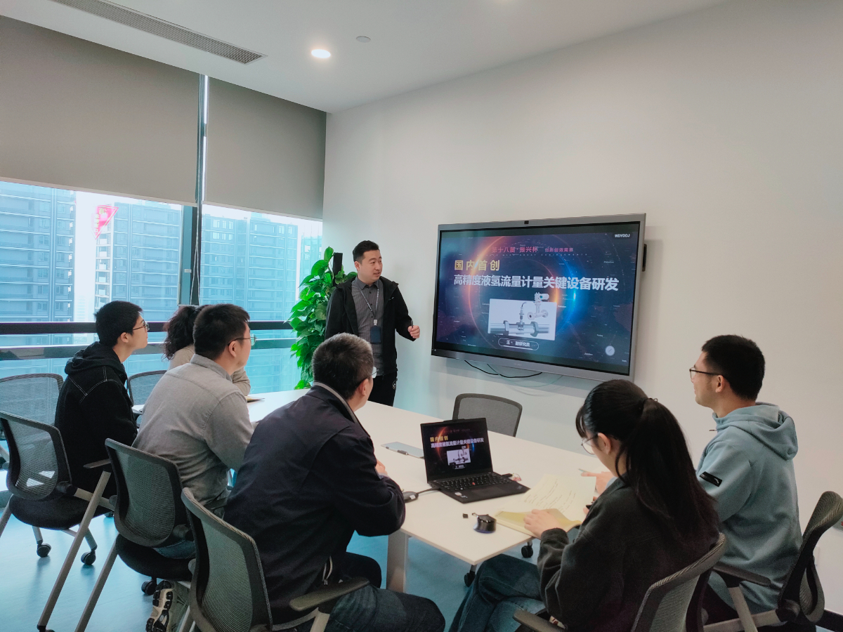 03-銅獎(jiǎng)項(xiàng)目-白馬湖實(shí)驗(yàn)室氫能(長興)有限公司的《高精度液氫流量計(jì)量關(guān)鍵設(shè)備研發(fā)》青創(chuàng)團(tuán)隊(duì)成員們正在進(jìn)行項(xiàng)目研討。 王軍 提供