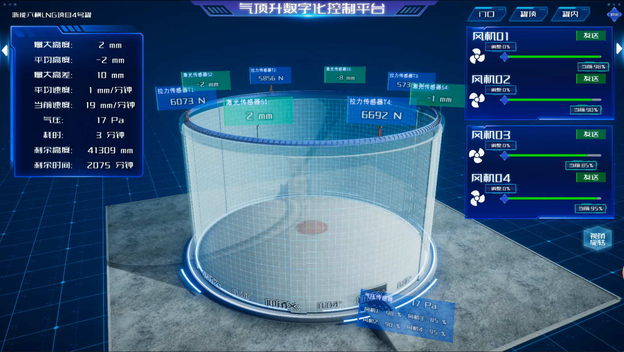 浙能六橫LNG項(xiàng)目共建4座儲(chǔ)罐,每座儲(chǔ)罐穹頂重達(dá)千噸,氣頂升上升高度相當(dāng)于“爬”上14層樓。為確保穹頂升起均衡平穩(wěn),項(xiàng)目使用了數(shù)智化頂升系統(tǒng),通過密布罐體的傳感器實(shí)時(shí)監(jiān)控頂升數(shù)據(jù),結(jié)合三維可視化智控,大幅減少了人工操作帶來的誤差,讓氣頂升的過程變得精準(zhǔn)、智能、安全。