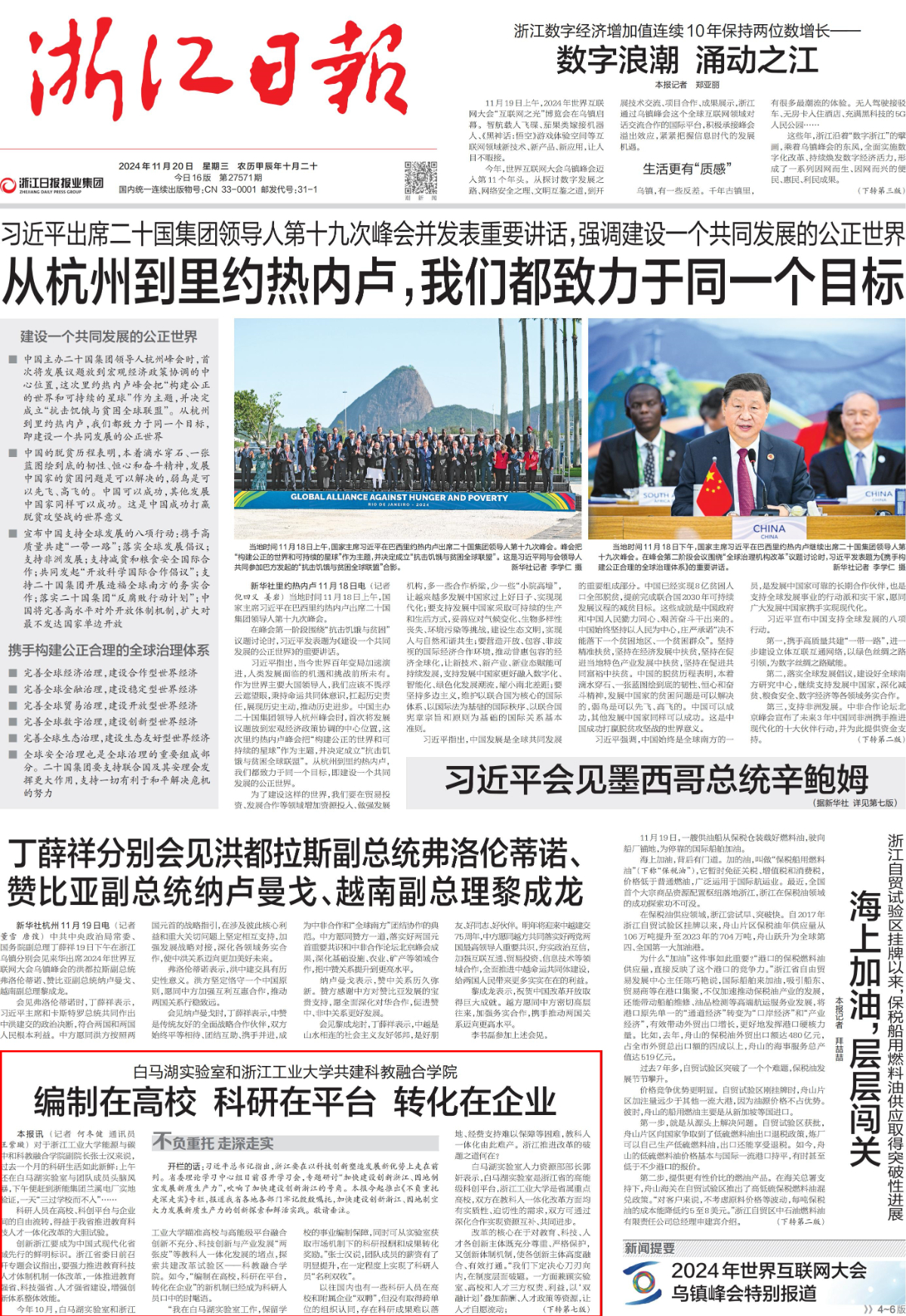 11月20日,《浙江日報》頭版聚焦白馬湖實驗室和浙江工業(yè)大學(xué)共建科教融合學(xué)院《編制在高校 科研在平臺 轉(zhuǎn)化在企業(yè)》。(下轉(zhuǎn)第七版)