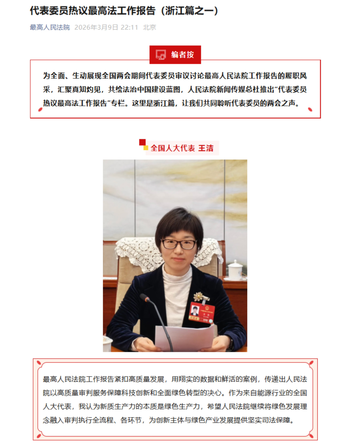 3月9日,“最高人民法院”微信公眾號邀請王潔同志圍繞最高法工作報告暢談感想。 “最高人民法院”微信公眾號 圖