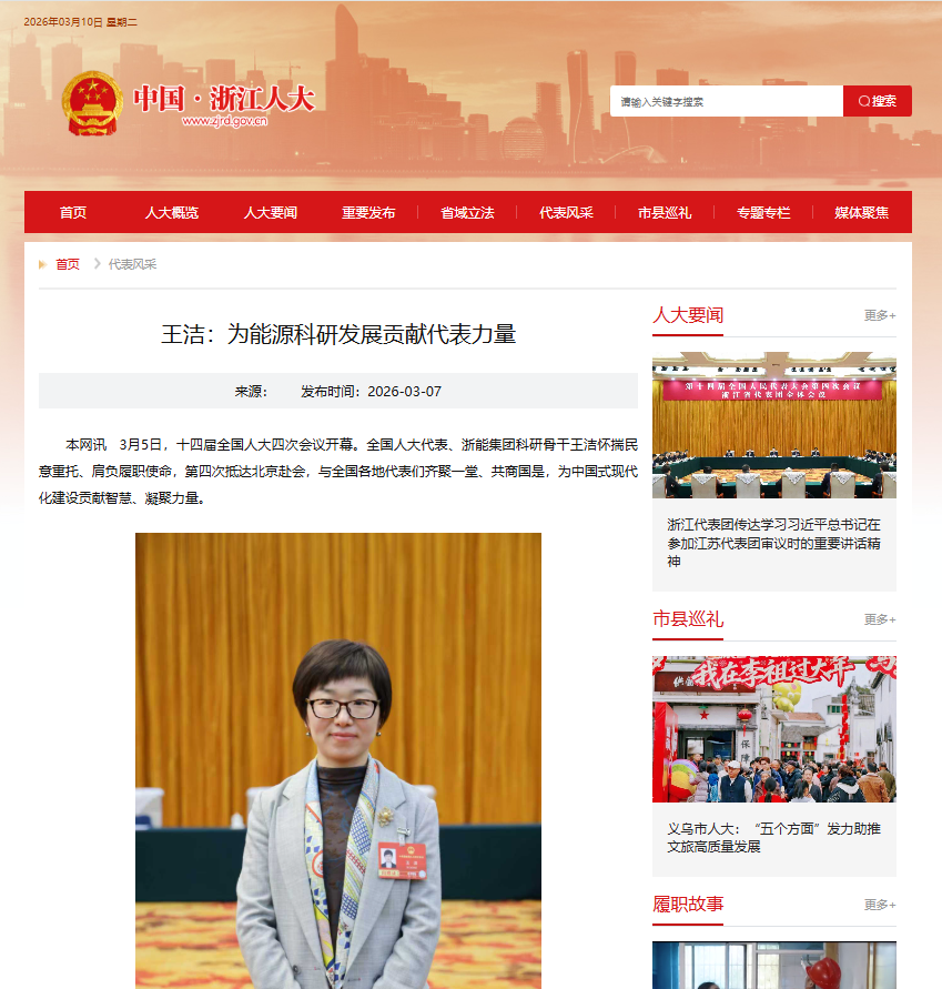 3月7日,浙江人大報道《王潔:為能源科研發展貢獻代表力量》。 浙江人大 圖