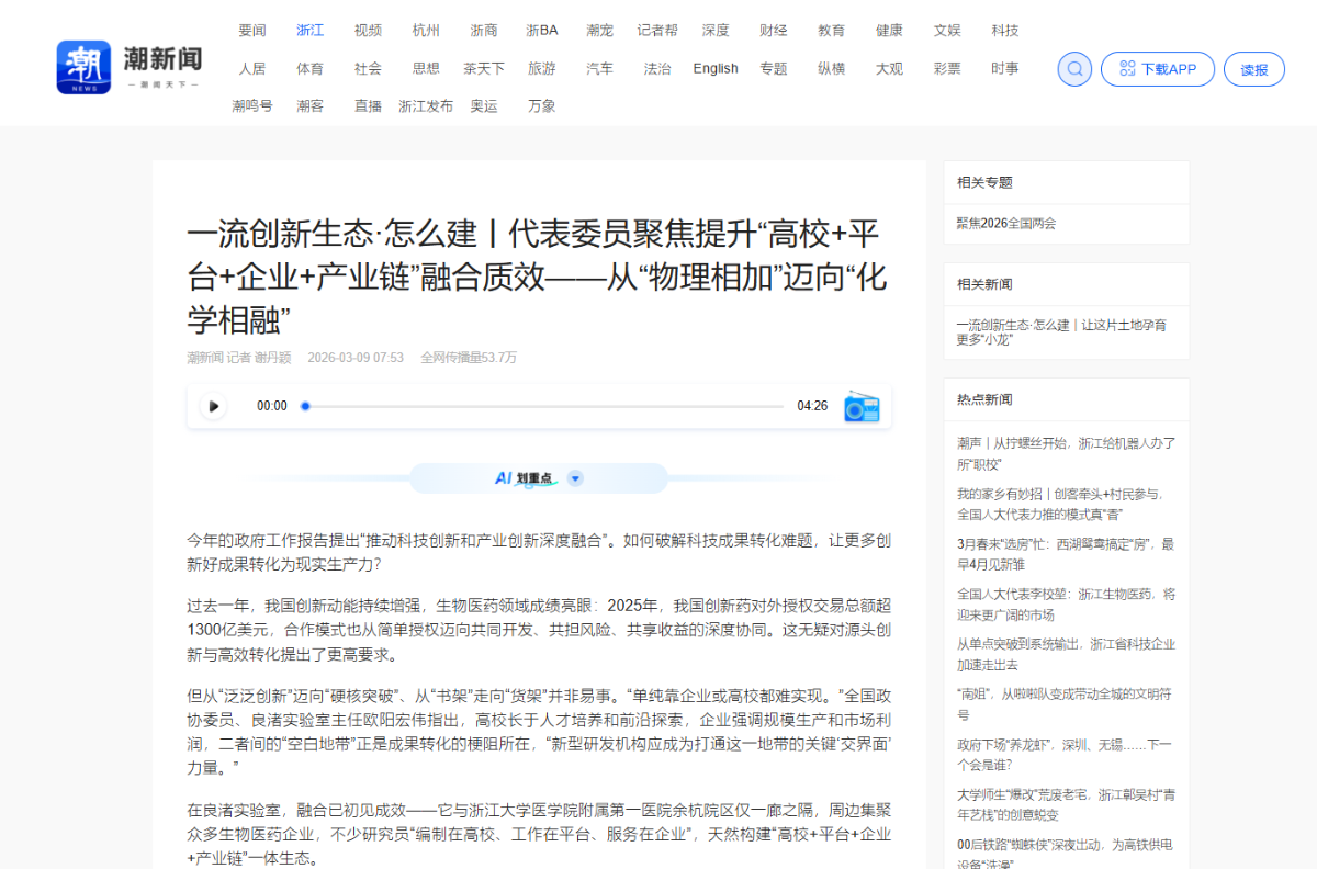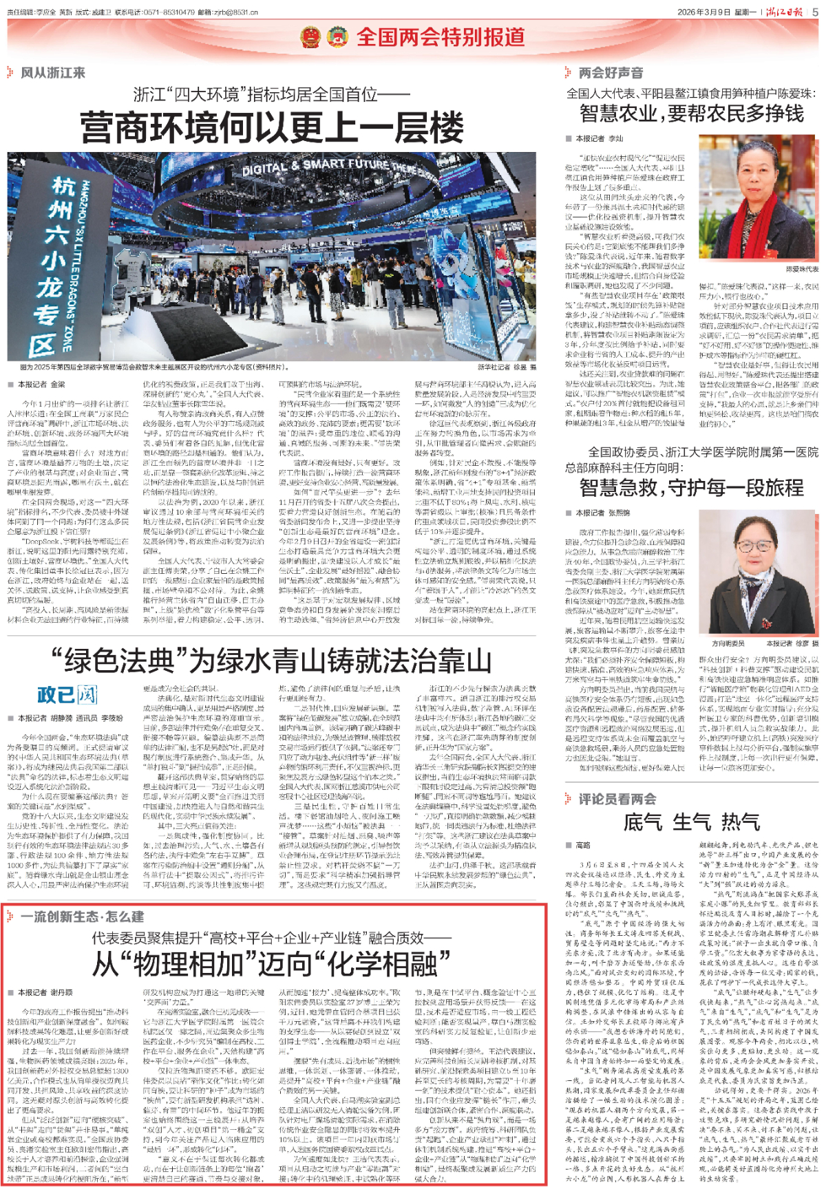 3月9日,《浙江日報》及潮新聞報道《代表委員聚焦提升“高校+平臺+企業+產業鏈”融合質效——從“物理相加”邁向“化學相融”》。 《浙江日報》、潮新聞 圖