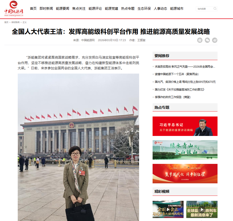 3月10日,中國能源網報道《全國人大代表王潔:發揮高能級科創平臺作用 推進能源高質量發展戰略》。 中國能源網 圖