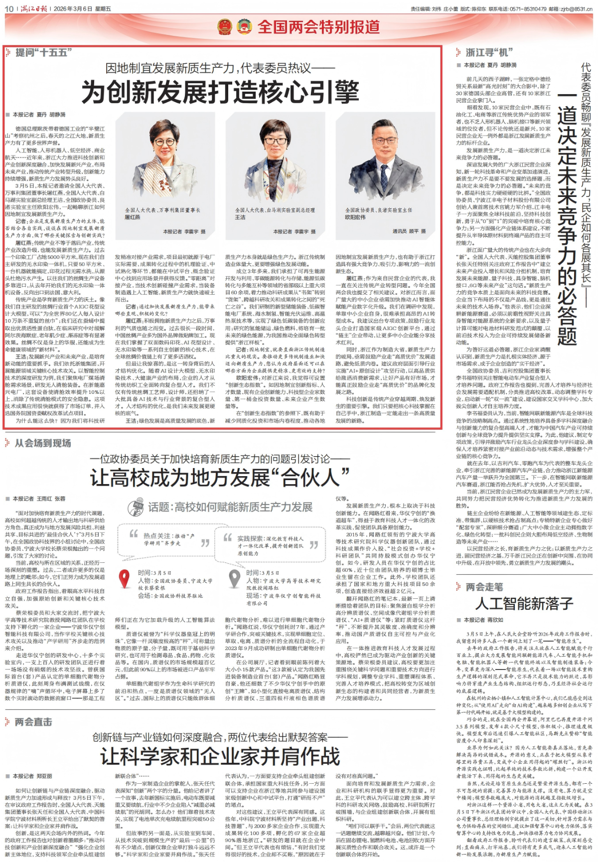 3月6日,《浙江日報》及潮新聞報道《因地制宜發展新質生產力,代表委員熱議——為創新發展打造核心引擎》。 《浙江日報》、潮新聞 圖