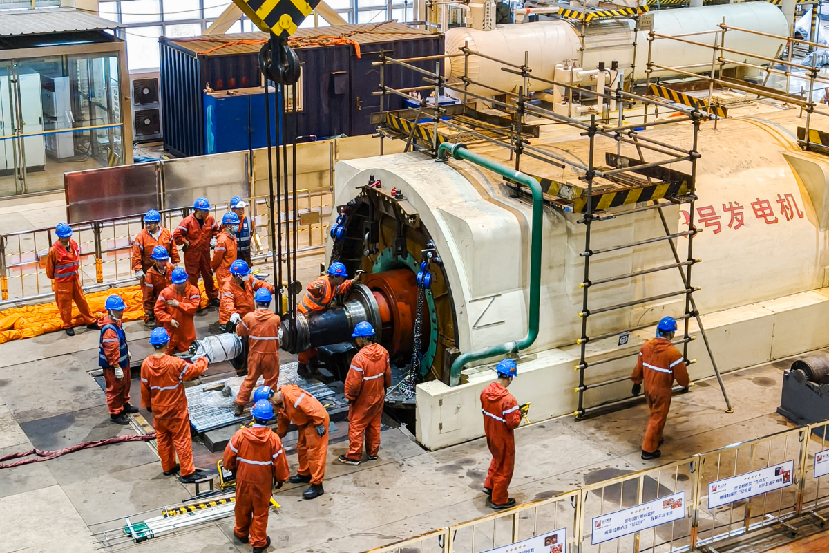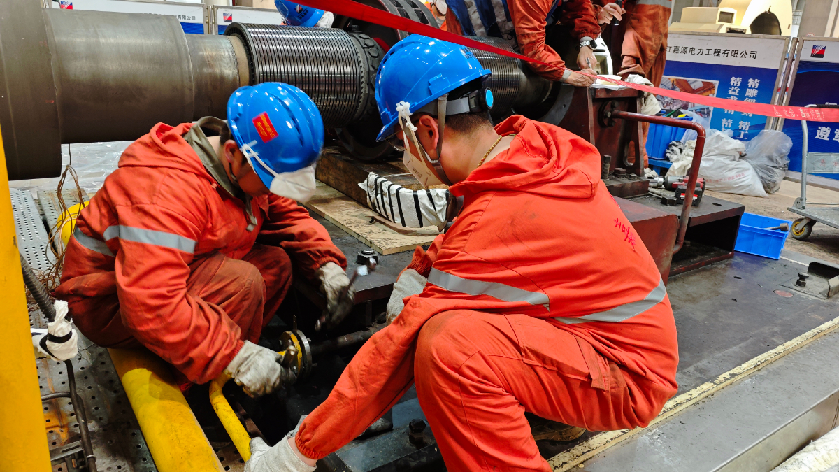 在浙能嘉華3號機(jī)組檢修現(xiàn)場,工作人員同心協(xié)作進(jìn)行抽轉(zhuǎn)子作業(yè)。 沈李越 攝