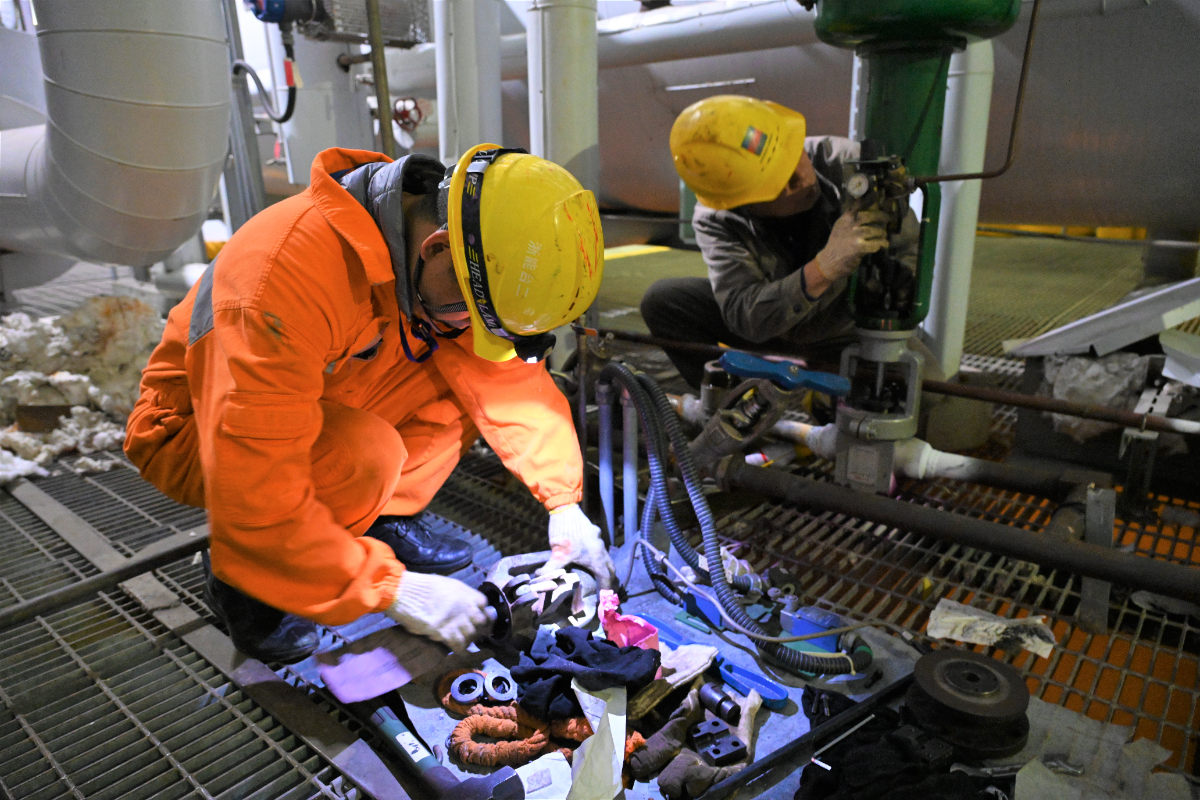 在汽輪機(jī)本體區(qū)域,浙能臺二電檢修人員常常需要在設(shè)備夾層間穿行。頭頂是密布的蒸汽管道,腳下是鏤空的鋼格柵,四周是各類金屬部件。每一次低頭、側(cè)身、爬高,稍不留神頭盔就會與周圍的鋼結(jié)構(gòu)發(fā)生接觸。范平虎回憶道:“那次凝汽器查漏檢修,我們在現(xiàn)場連續(xù)作業(yè)了10個小時,凝汽器內(nèi)部結(jié)構(gòu)緊湊,作業(yè)面有限,每一步都需要格外謹(jǐn)慎,頭盔上的每一次碰撞,都是對安全操作的一次提醒,大家始終佩戴規(guī)范,有了頭盔和安全帶的保障,我們干起活來也就更得心應(yīng)手了。”