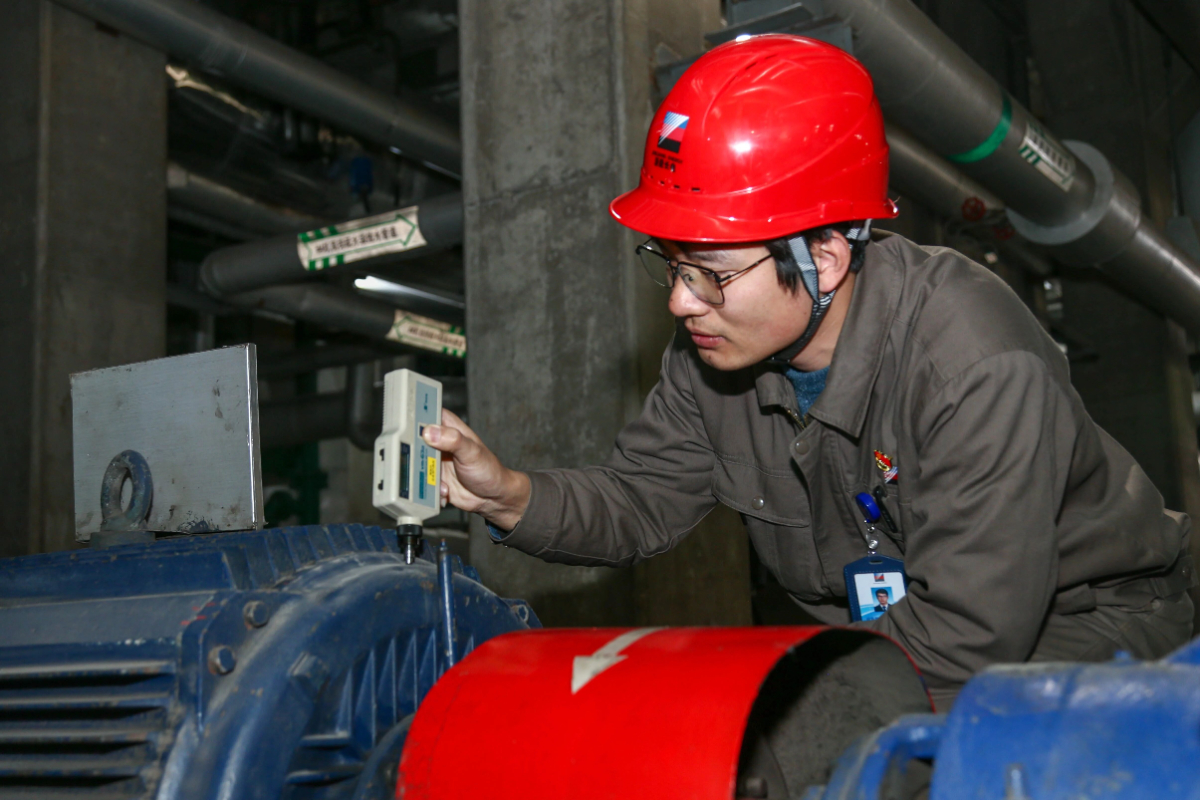 浙能長電電氣點檢王利冰測量閉冷泵振動值。 鄭慧瑗 攝