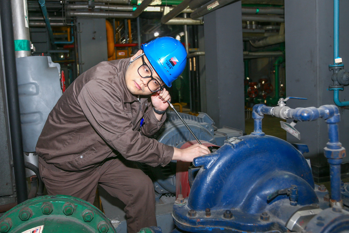 浙能長電維護部機務班張至昊俯下身,仔細檢查閉冷水泵的運行情況。他對關鍵部位逐一辨析,確認各個部位聲響正常,這才放心地直起身。這套“聽聲辨狀態”的本事,是張至昊跟著老師傅在設備旁一點點磨出來的。