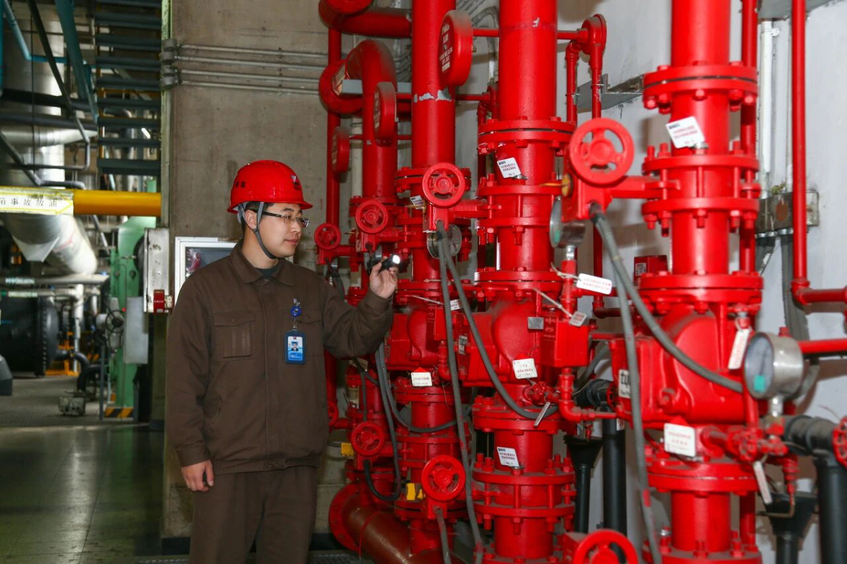 浙能長電安全專職孫國泰檢查消防水系統。 鄭慧瑗 攝
